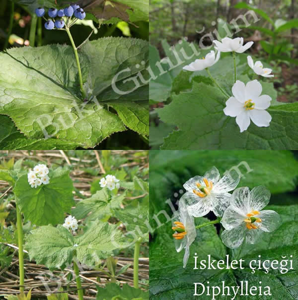 İskelet çiçeği olarak bilinen Diphylleia’nın Kuzeydoğu Amerika, Çin ve Japonya’da görülen 3 farklı türü var. Çok yıllık ve nadir bulunan türden bir çiçek. Sık, gölgelik ve nemli ormanları ya da dağları seviyor. Antiseptik ve kanser önleyici olduğu iddiası var ama henüz bilimsel bir araştırmaya konu olmamış. Bu arada sadece Japonya’daki türün meyvaları yenebiliyor.